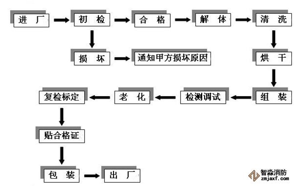 進廠→初步檢測→不合格部分通知甲方并告知原因→合格部分解體→清洗→烘干→組裝→檢測調試→老化→復檢標定→貼合格證→包裝→出廠→安裝→測試。