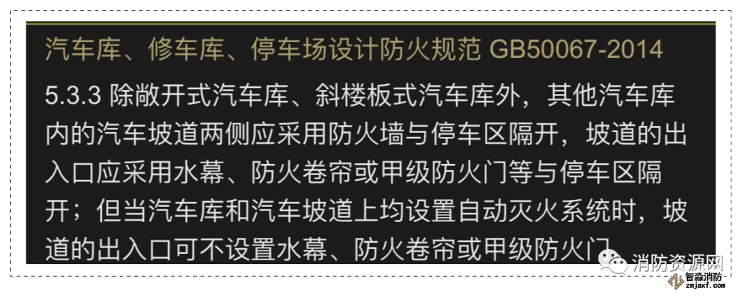 汽車庫直接對外的出口坡道部位,是否需要采取防火分隔措施或設置自動滅火系統,需要根據汽車庫出口與建筑物的防火間距確定!