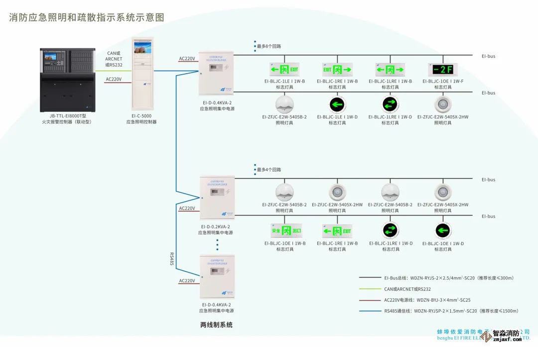 1、應急照明集中電源經應急照明分配電裝置配接消防應急燈具;