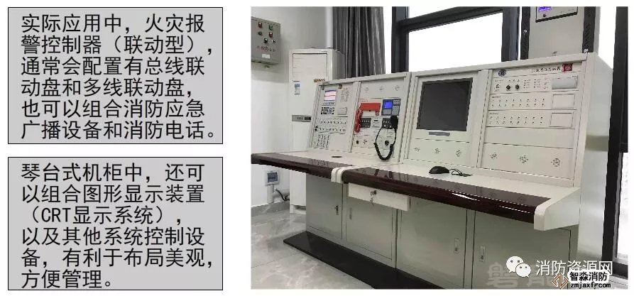 4、實際應用中,火災報警控制器(聯動型),通常會配置有總線聯動盤和多線聯動盤,也可以組合消防應急廣播設備和消防電話、組合圖形顯示裝置(CRT顯示系統)。在較大規模的系統中,較廣泛的應用是琴臺式機柜,布局美觀,方便管理。