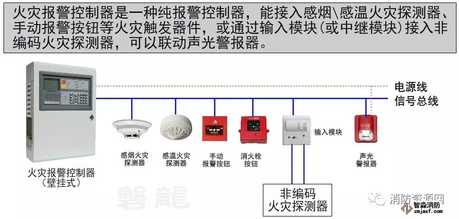 火災報警控制器是一種純報警控制器,通常采用壁掛式主機,能接入感煙感溫火災探測器、手動報警按鈕等火災觸發器件,或通過輸入模塊接入非編碼火災探測器,也可以控制簡單的聯動設備(聲光警報器等)。